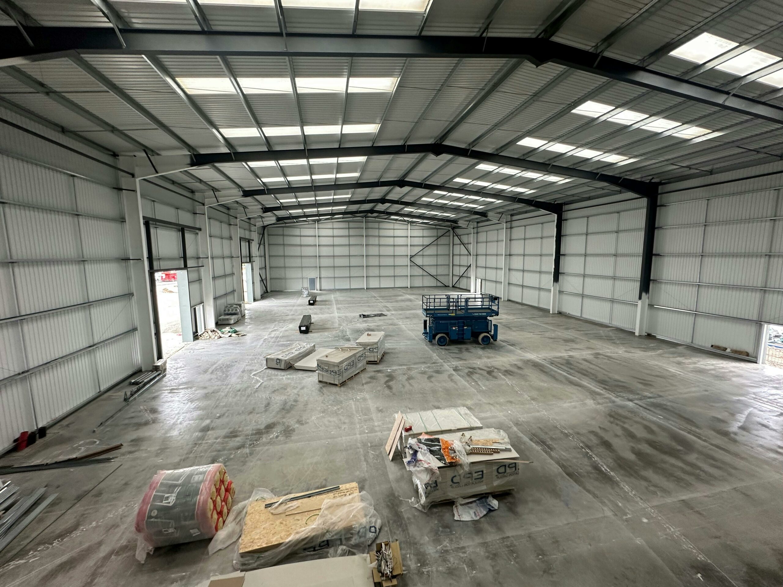 The building is of steel portal frame construction with insulated steel sheet cladding to all the elevations and the roof which incorporates translucent panels.